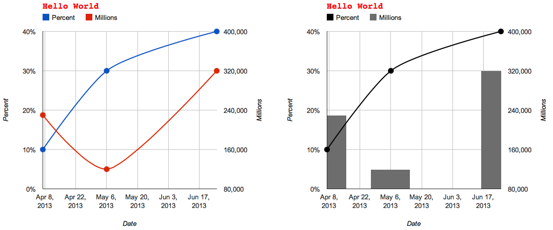 In my first example I display two series of dummy data in a line chart with two axes. The left hand scale is in percentages and the right hand scale in amounts. Note in the code below how I set the various parameters and the placements of the different kinds of brackets.In my second example I plot the data in a combo chart, with the amounts in millions to be displayed in bars and the percentage values as a line. Again, I set the various parameters in the options argument. For more details see the help pages and examples of gvisComboChart and other googleVis charts. Note that the options do vary from chart type to chart type, particularly for a motion chart.