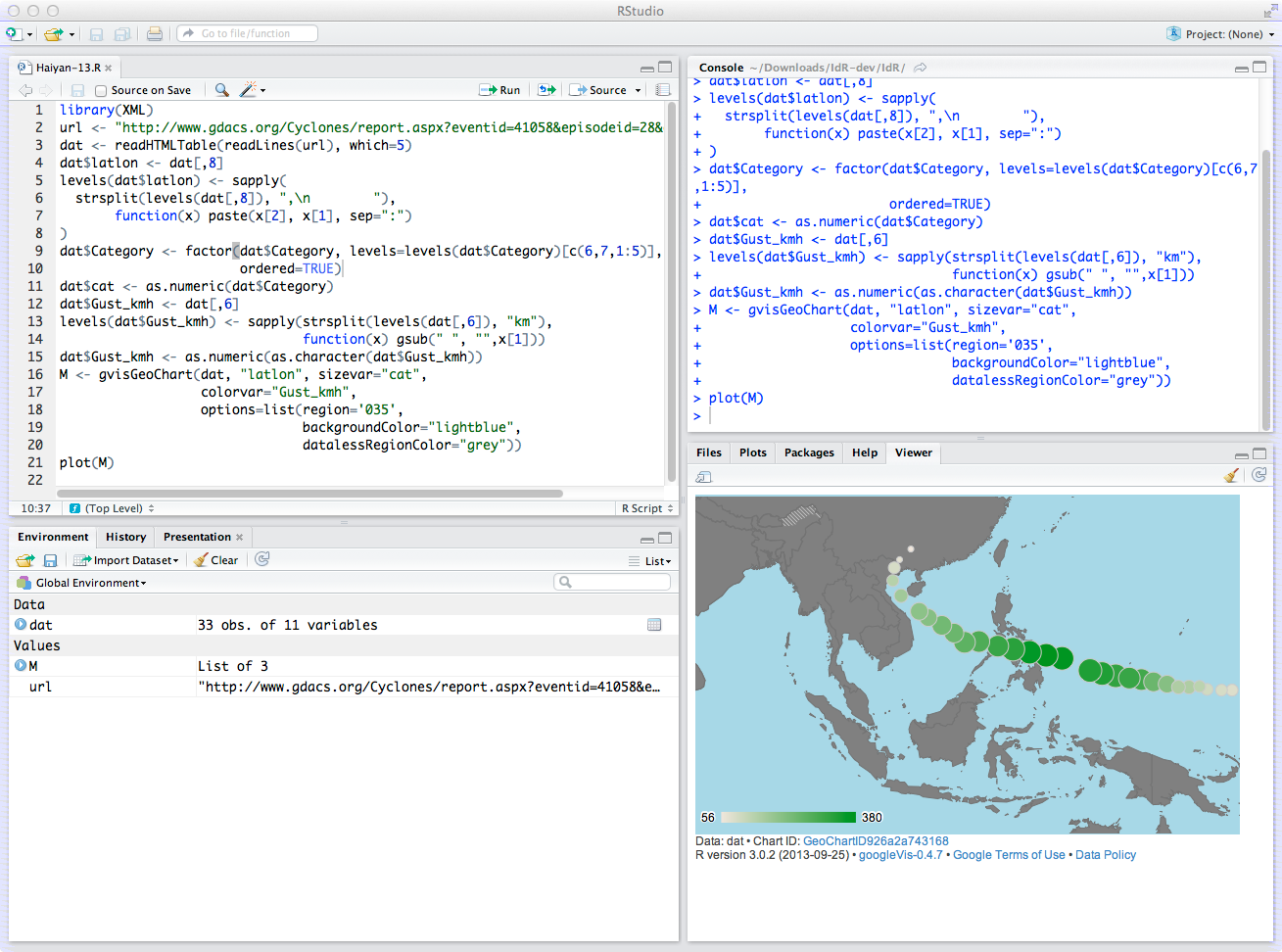 The screen shot below shows a geo chart within the RStudio Viewer pane of the devastating typhoon track of Haiyan that hit Southeast Asia last week.