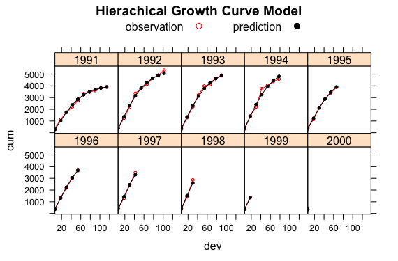 However, what I’d like to do is the opposite, I know the cumulative claims position to date and wish to estimate the ultimate claims cost instead. If the claims process is fairly stable over the years and say, once a claim has been notified the payment process is quite similar from year to year and claim to claim, then a growth curve model is not unreasonable. Yet, the number and the size of the yearly claims will be random, e.g. if a windstorm, fire, etc occurs or not. Hence, a random effect for the ultimate loss cost across accident years sounds very convincing to me.